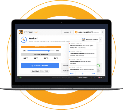 Do more with your PC — turn it into a digital goldmine! Create your own crypto farm: connect all of your Windows or macOS computers, watch them bring you long-term income, and withdraw whenever you want! CT Farm is your way of conquering new heights and getting sky-high BTC earnings!